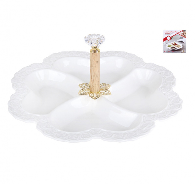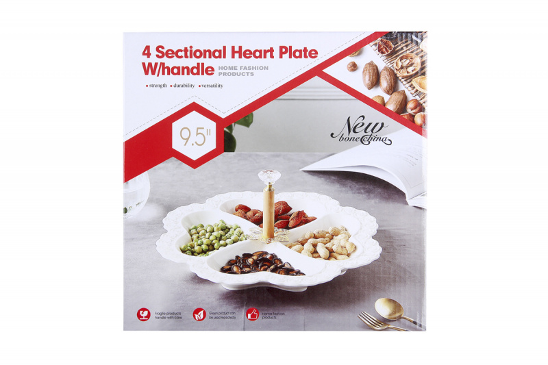 Менажница фарфоровая 4-х секционная 24 см с ручкой Сердце Коралл.