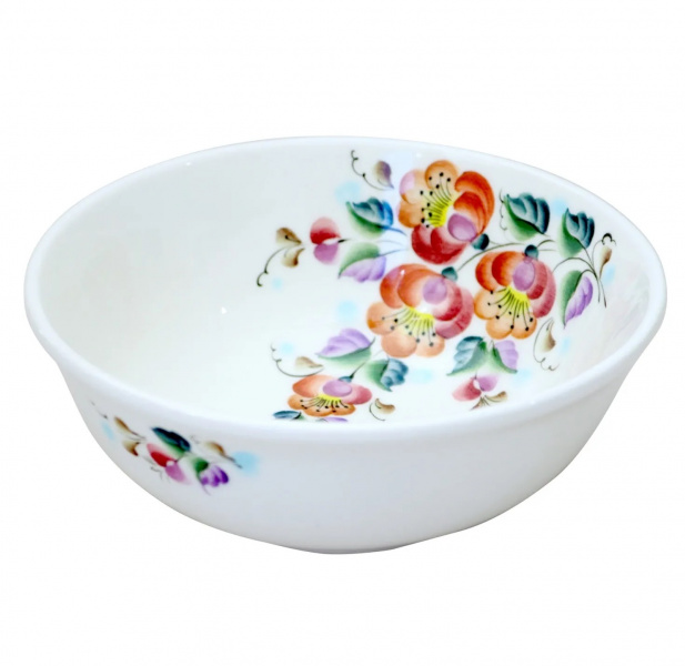 Универсальная миска, подойдет для хранения и подачи различных продуктов (салатов, овощей, солений, гарниров). Расписанная яркой цветочной росписью, изделие выглядит нежно и изящно.