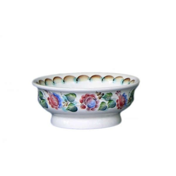 Глубокая тарелка, имеющая форму полусферы. Основное функциональное назначение миски – подача на стол жидких кушаний, различных супов, похлебок, каш. Представленная миска изготовлена из натуральной, экологически-чистой белой глины, расписана вручную и покрыта глазурью.