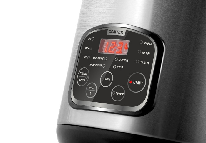 Мультиварка Centek CT-1490 оснащена электронным управлением, благодаря чему выбор программ осуществляется легко и просто. Функция «Мультиповар» позволяет устанавливать время и температуру приготовления того или иного блюда вручную. Также есть таймер отсрочки старта продолжительностью до 24 часов. Мультиварка мощностью 860 Вт обеспечит быстрое приготовление пищи. После окончания приготовления можно воспользоваться функцией поддержания температуры в чаше.