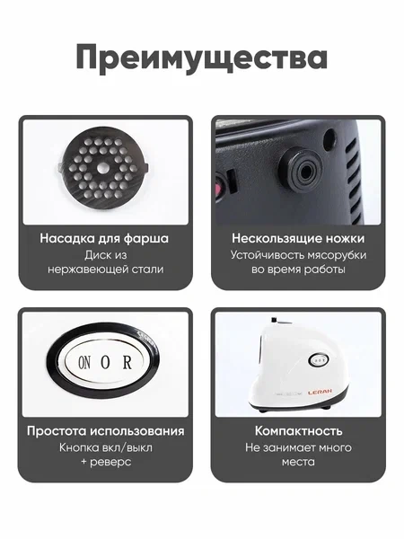 Надёжность Если в мясе окажется кость или хрящ, сработает автоматическое отключение, которое убережёт устройство от перегрева или поломки. Функция реверс поможет очистить мясорубку без её разборки.