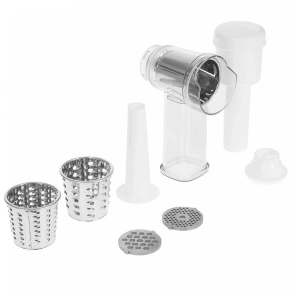 | Комплектация | документация, загрузочный лоток, насадка-терка крупная, насадка-терка мелкая, насадка-шинковка, насадка для кеббе, насадка для колбас, нож, перфорированный диск крупный, перфорированный диск мелкий, перфорированный диск средний, толкатель х 2 шт., шнек |