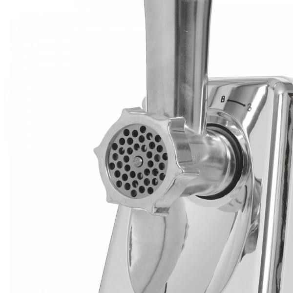 Нож мясорубки изготовлен из нержавеющей стали, что гарантирует его долговечность и остроту. В комплекте с мясорубкой идут три режущих диска из металлического сплава с размерами 3 мм, 5 мм и 7 мм.