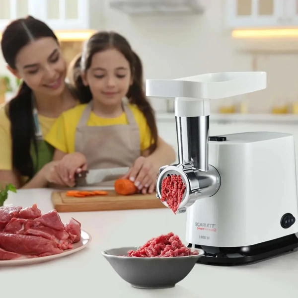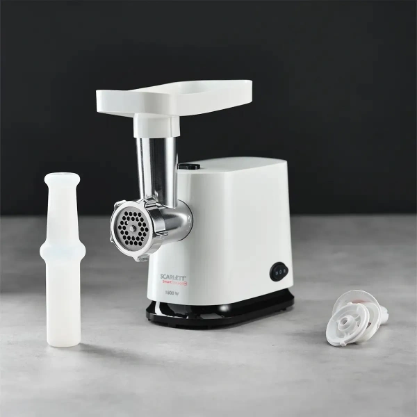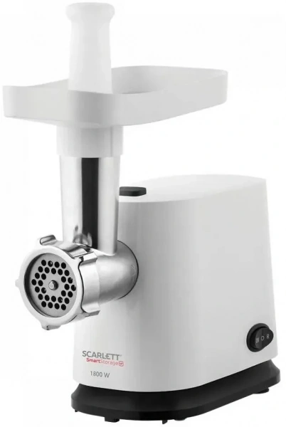Мясорубка электрическая Scarlett SC-MG45S65 выполнена в белом пластиковом корпусе и обладает мощностью 1800 Вт. О высокой производительности прибора говорит то, что за минуту он способен переработать в фарш до 2 кг мяса. Это делает устройство незаменимым для мясных заготовок: мясорубка экономит время на приготовлении продуктов. Особенность модели в поддержке функции реверса, что позволяет легко достать застрявшие куски жесткого мяса, жир и жилы.