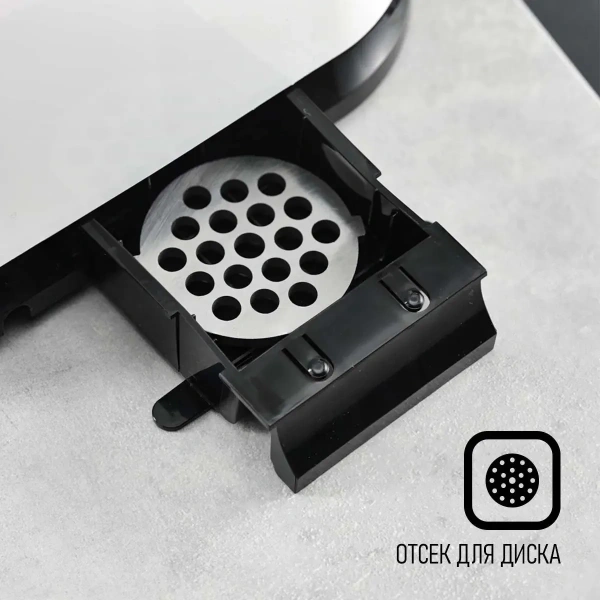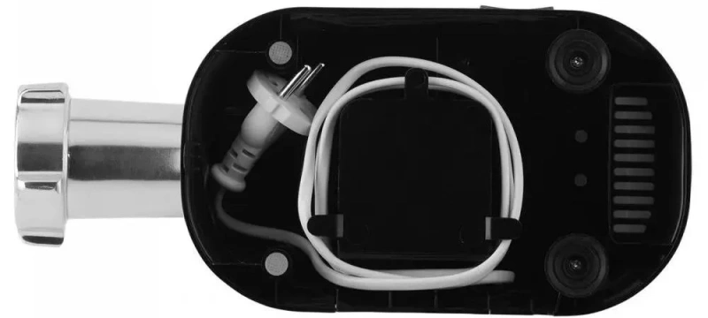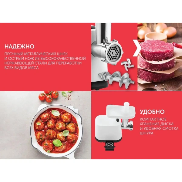 Для компактного хранения шнура предусмотрена его смотка, а внутри корпуса содержится отсек для хранения аксессуаров. Мясорубка устанавливается на четыре ножки для большей устойчивости.