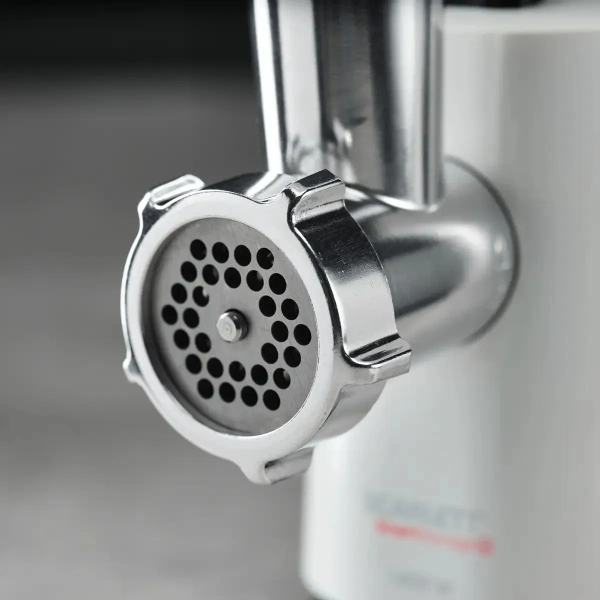 Функциональность Scarlett SC-MG45S65 расширяет наличие дополнительных насадок для колбас и кеббе в комплекте. Благодаря им вы сможете чаще радовать семью кулинарными изысками. Два перфорированных диска содержат отверстия различного диаметра ‒ 5 мм и 7 мм, что позволяет готовить фарш разной консистенции.