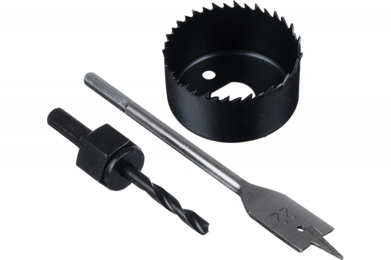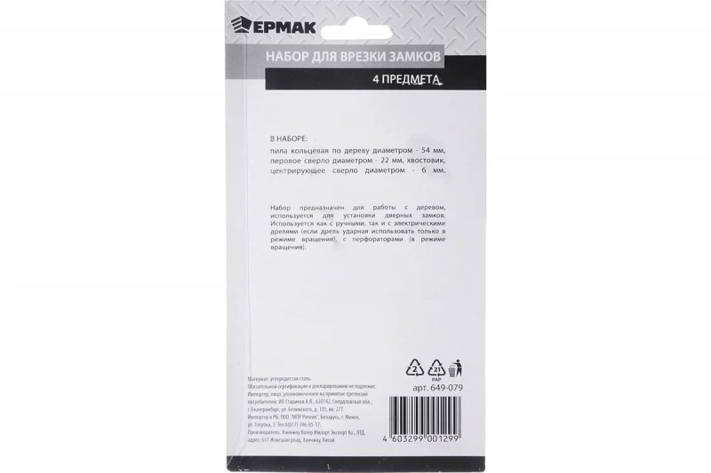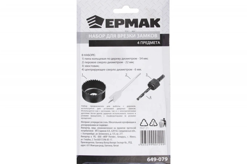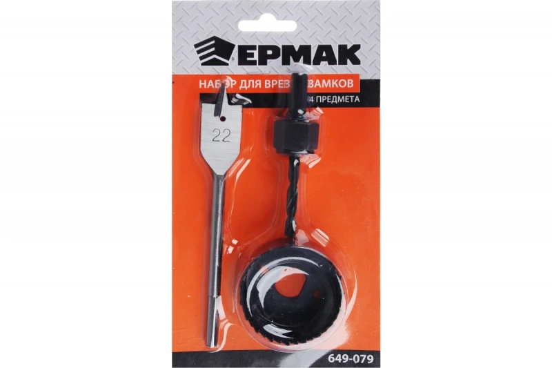 Набор для врезки замков ЕРМАК состоит из 4-х предметов, включая перовое сверло с шестигранным хвостовиком, кольцевую пилу и направляющее сверло. Используется для установки замков в дверях из древесины, а также для создания сквозных отверстий в таких материалах как ДСП, ДВП, гипсокартон. Все элементы выполнены из углеродистой стали и имеют высокий запас прочности.