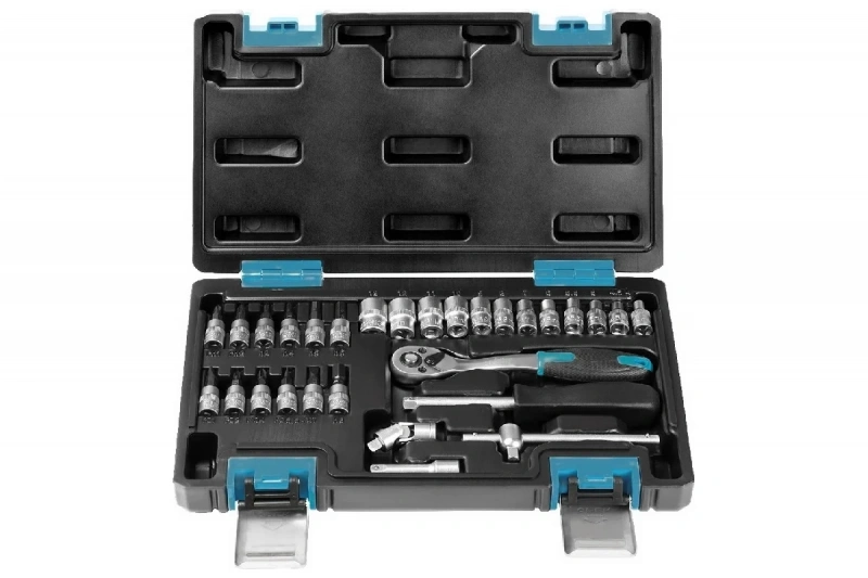 Головки и биты выполнены из качественной хромованадиевой стали, что обеспечивает высокую прочность и долговечность. Головки отлиты одним куском стали. Никелированное матовое покрытие защищает инструмент от коррозии и обеспечивает длительный срок службы. Удобный кейс позволяет рационально хранить и транспортировать инструмент.