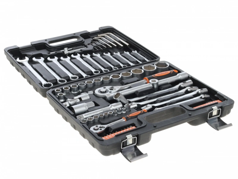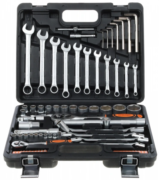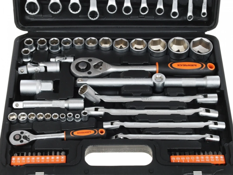 Набор инструментов Кузьмич НИК-006/77 станет для вас отличным выбором, если вы хотите иметь под рукой все необходимое для работы с наиболее часто используемым в быту и в профессиональной сфере крепежом. Особенностью набора является наличие большого количества ключей, в числе которых комбинированные, шестигранные и шарнирные ключи. Также в комплекте есть торцевые головки, биты, свечная головка 21 мм, удлинители, трещотки, карданные шарниры и Т-образный вороток.