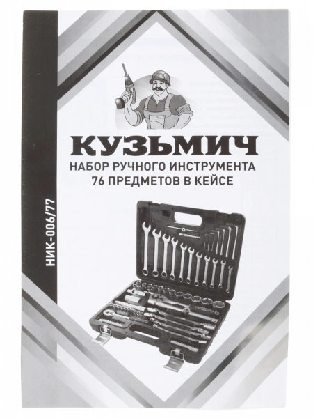 Набор инструментов Кузьмич НИК-006/77 поставляется в кейсе, изготовленном из ударопрочного пластика. Кейс компактен, поэтому его можно с легкостью носить с собой или хранить даже в условиях ограниченного пространства. На кейс нанесена наклейка с перечнем инструментов, обеспечивающая набору презентабельный вид. Инструменты, которыми укомплектован набор, изготовлены из хромованадиевой стали. Этот материал, отличающийся ударостойкостью и стойкостью к усталостным нагрузкам, наилучшим образом подходит для производства инструментов, рассчитанных на длительный срок эксплуатации.