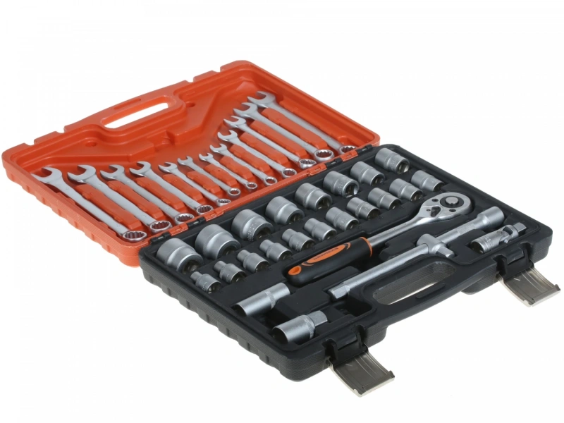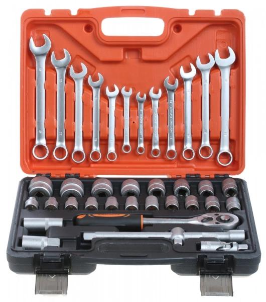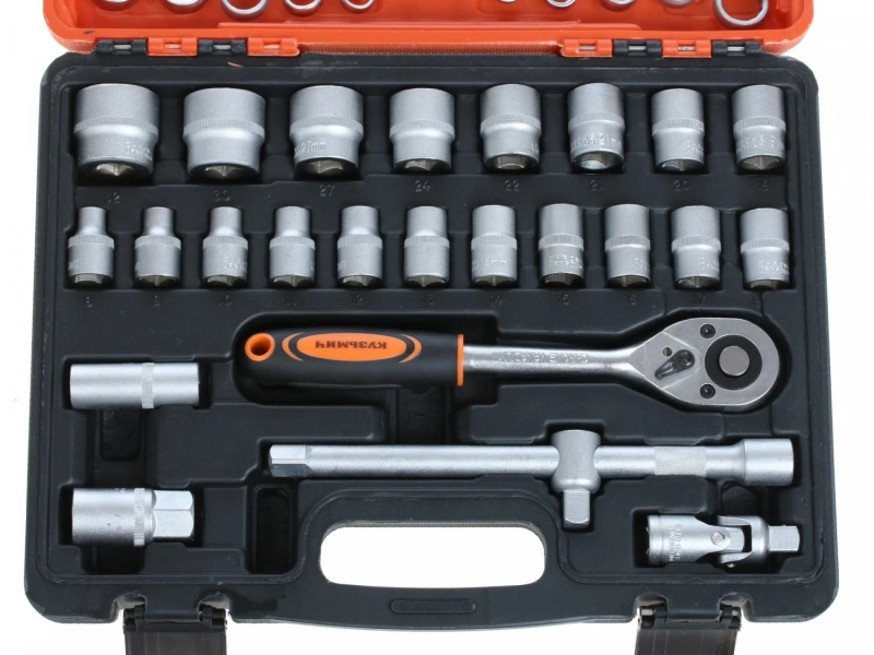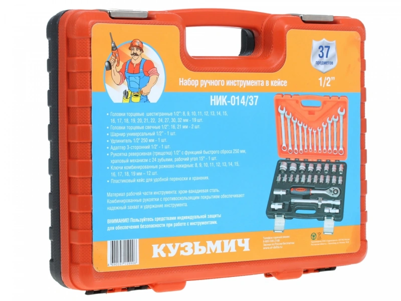 Набор Кузьмич НИК-014/37 включает в себя 37 предметов. Среди них – головки торцевые, головки свечные, удлинители, трещотка реверсивная, шарнир универсальный, адаптер трехсторонний, комбинированные ключи и т. д. Большое количество доступных инструментов станет преимуществом в пользу приобретения представленного комплекта.