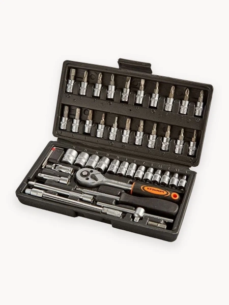 Комплектация - T10, T15, T20, T25, T30, T40, SL: 4, 5.5, 7 мм, PH1, PH2, PH3, 13 головок торцевых шестигранных 1/4”: 4, 4.5, 5, 5.5, 6, 7, 8, 9, 10, 11, 12, 13, 14 мм, 21 головка торцевая со вставкой 1/4”: HW: 3, 4, 5, 6, 7, 8 мм, PZ1, PZ2, PZ3, рукоятка реверсивная (трещотка) 1/4” с функцией быстрого сброса 155 мм, храповый механизм с 24 зубьями, рабочий угол 15°, 2 удлинителя 1/4”: 50 и 100 мм, гибкий удлинитель 1/4” 150 мм, шарнир универсальный 1/4”, рукоятка-битодержатель 1/4” 155 мм, вороток Т-образный 1/4”, 3 ключа шестигранных: 1.5, 2, 2.5 мм, переходник универсальный 1/4”