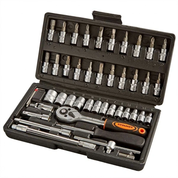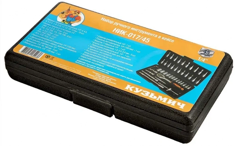Набор ручного инструмента «Кузьмич» НИК-017/45 поставляется в специальном пластиковом кейсе, оснащенном рукоятью для удобного перемещения. Есть защелки для фиксации створок. Все инструменты рассортированы по зонам, всего насчитывается 45 предметов: шесть «шестигранников», 13 насадок для гаек, шесть крестовых и три шлицевые насадки, а также набор для автомобильного ремонта. Материалом послужила качественная сталь. Вес всего набора составляет 1,2 кг.
