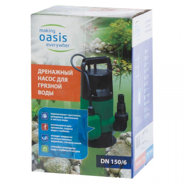 Насос дренажный Oasis DN 150/6 — это отличный садовый насос, который представляет собой компактную базовую модель, которая подходит для откачивания воды из погребов, колодцев, бассейнов или любых других резервуаров. Кроме того, любой знает о том, что при таянии снега возникает проблема затопления, насос поможет справиться с этой проблемой. Насос подходит для воды с мелкими частицами загрязнения, однако не более 5 мм. Высокая мощность и способность выдерживать высокое давление делает насос идеальным инструментом для откачивания дренажных, дождевых и грунтовых вод из затопленных подвальных помещений. Подходит для отвода фильтрационных отработанных загрязненных жидкостей из сточных канав, бассейнов и котлованов, можно использовать в промышленных целях. Так же насос подходит для орошения, подачи воды с глубины колодца или из других источников.