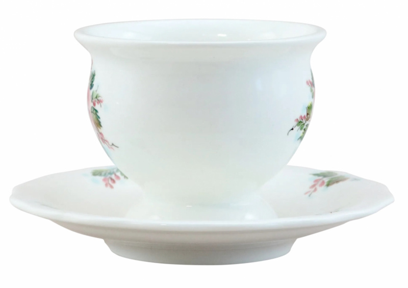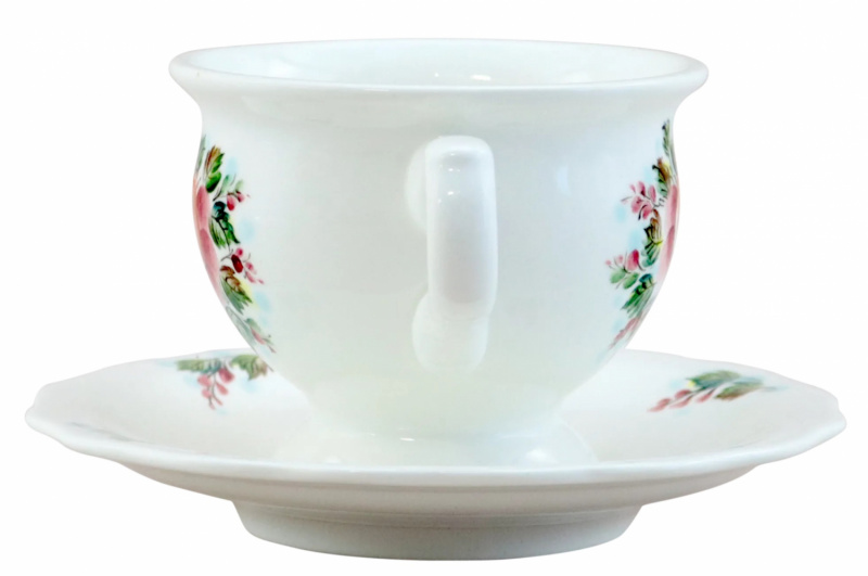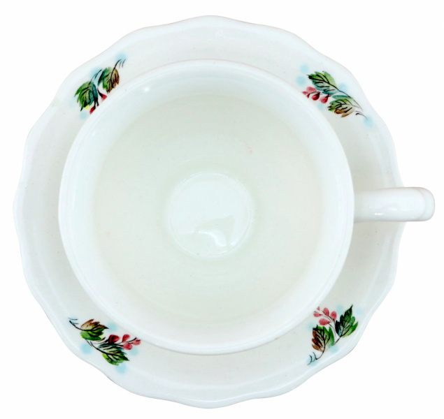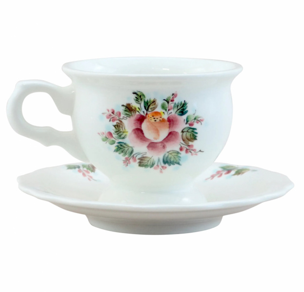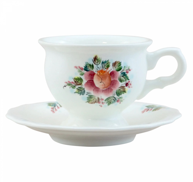 Небольшая и изящная чайная пара, декорирована подглазурной росписью с изображением цветочка, радует глаз и поднимает настроение. Изделие продается отдельно или в составе чайного набора "Белый танец".