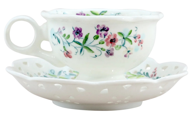 Маленькая чайная пара "Чабрец" как большое произведение искусства. Изделие декорировано подглазурной росписью с изображением чабреца, завершает гармоничный образ художественная вырезка и нежная оборка-окантовка на блюдце. Чайная пара обречена стать вашей любимицей.