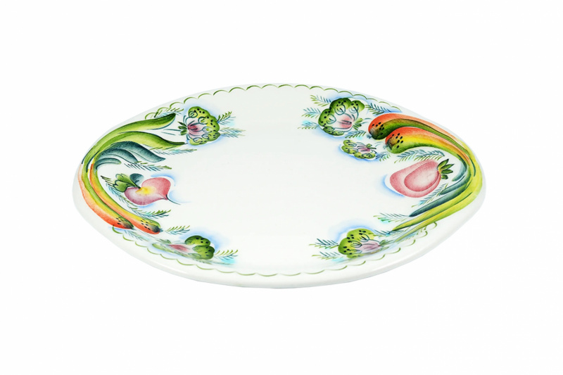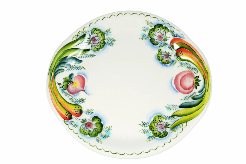 Для подачи вторых блюд рекомендуем присмотреться к этому подтарельнику. Удобный по форме, он декорирован яркой ручной росписью. А изображенные на нем овощи и зелень выглядят очень сочно и реалистично. Изделие - часть популярной коллекции Зеленый лук, состоящей из супника, глубоких тарелок, салатника, хлебницы, кувшина с чашками и других предметов, расписанных в одном стиле.