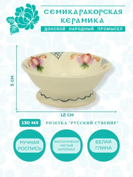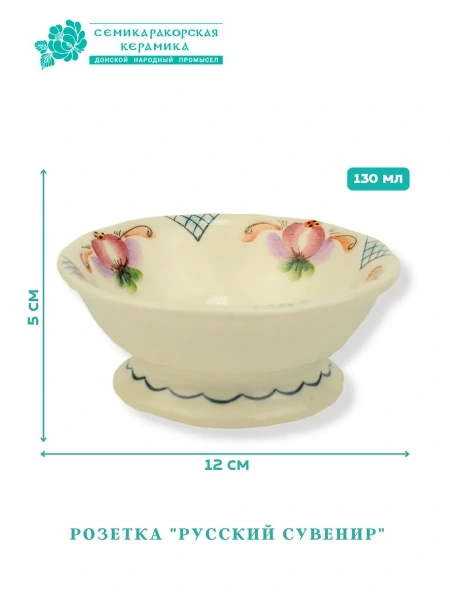 Для красивой подачи десертов на стол (варенья. меда, джема и пр.) рекомендуем обратить внимание на эту изящную розетку. Декорированное нежной цветочной росписью, изделие станет достойным украшением любого чайного сервиза. Размеры в см ДхШхВ: 11,4х11,4х5. Объем пиалы 130 мл.