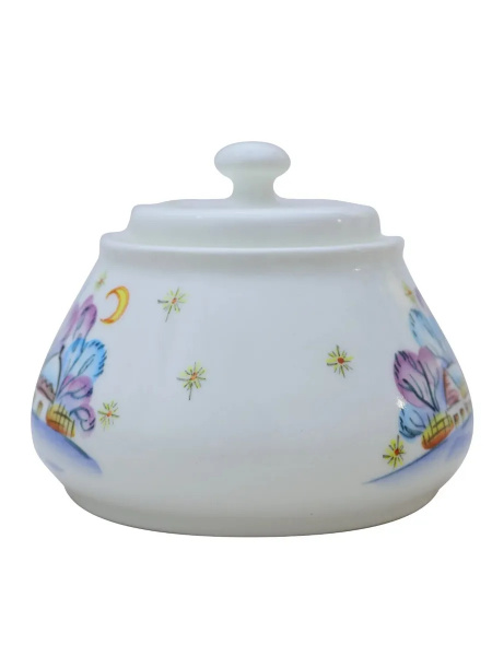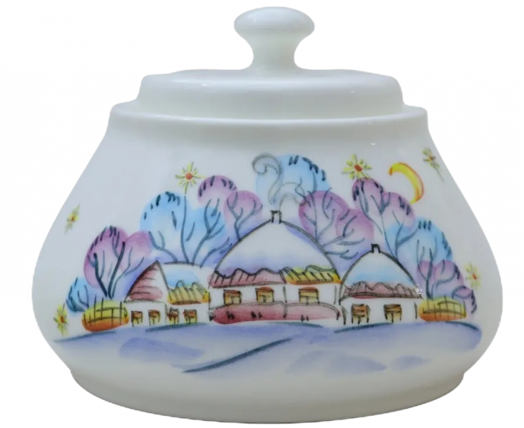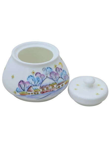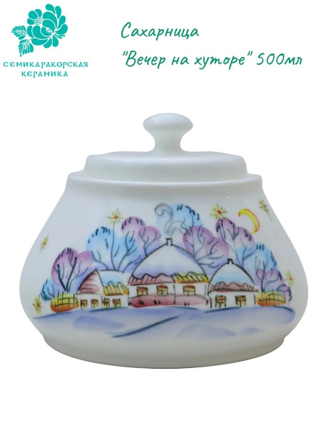 Сахарница "Вечер на хуторе" 500мл, 125х125х100мм Фаянс. Ручная роспись. Это замечательное решение для вашей кухни. Фарфоровая сахарница станет не только полезным приспособлением, но и стильным элементом декора Вашего стола. Рисунок может незначительно отличаться от фотографии.