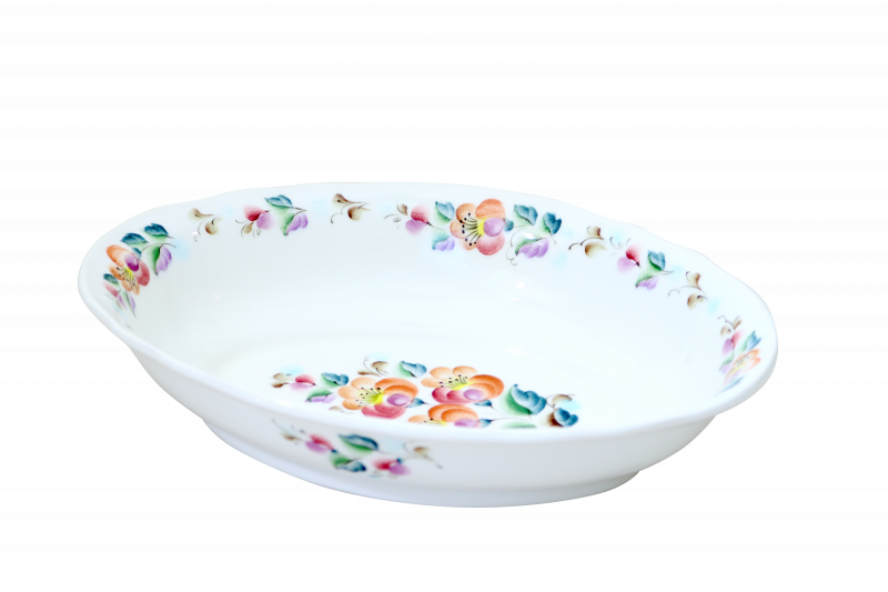 Универсальный, вместительный салатник, подойдет для подачи различных продуктов (салатов, овощей, солений, гарниров). Расписан яркой цветочной росписью, изделие выглядит нежно и изящно. Является частью коллекции "Каприз".