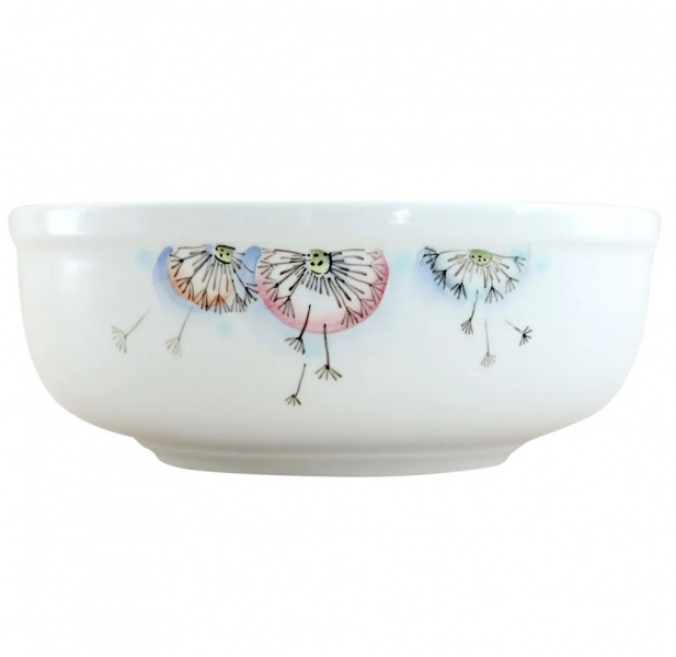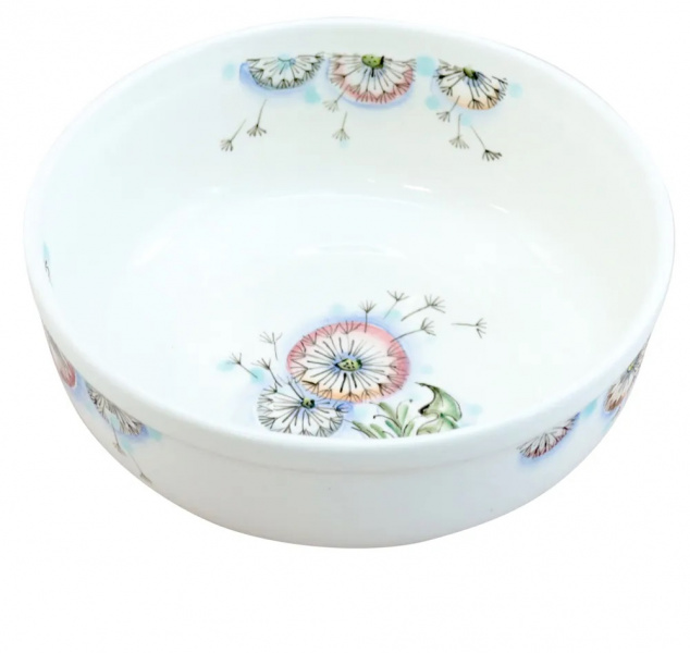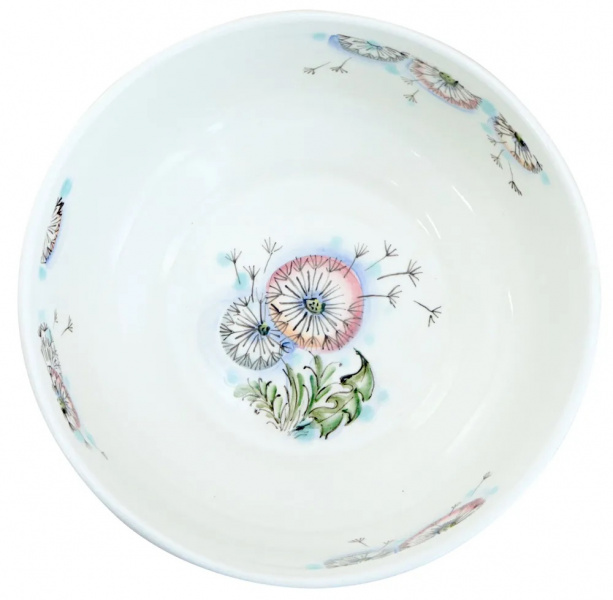 Вместительный салатник, универсальной и современной формы — подойдет как для праздничного стола, так и на каждый день. Декорирован оригинальной подглазурной росписью в виде цветов одуванчиков.