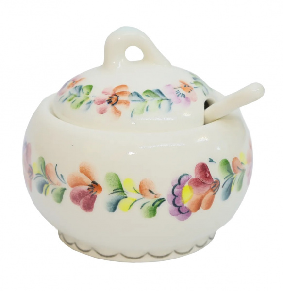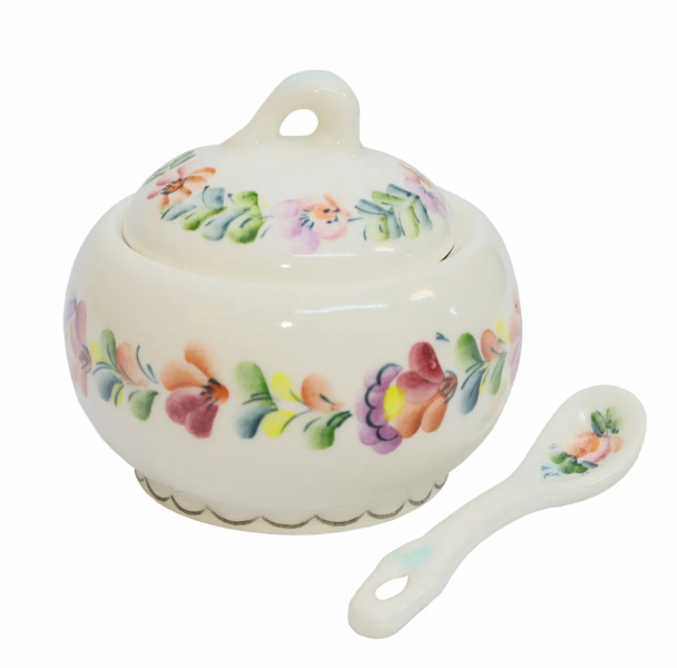 Даже такая маленькая столовая деталь, как солонка, может стать отличным дополнением к сервизу или оригинальным сувениром с Дона. Солонка в форме горшочка дополнена крышкой и ложечкой. Декорирована нежной подглазурной цветочной росписью.