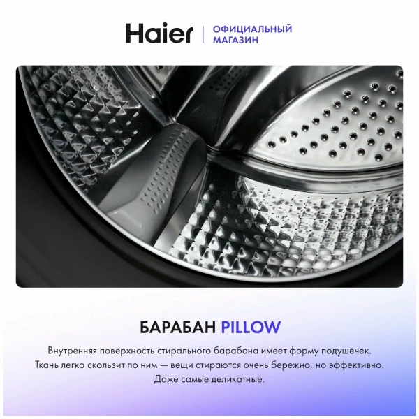 Внутренняя поверхность стирального барабана имеет форму подушечек. Ткань легко скользит по ним — вещи стираются очень бережно, но эффективно. Даже самые деликатные.