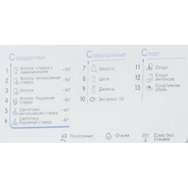 | Программы | быстрая 15 мин, джинсы, интенсивная/синтетика, интенсивная/хлопок 90°C , отжим, полоскание, синтетика 40°C, слив, спорт, спортивная обувь, спорт интенсив, хлопок 40°C + бережная, хлопок 60°C , хлопок 90°C + замачивание, шелк, шерсть |