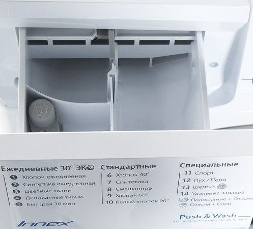 | Дополнительные режимы и функции | Push&Wash, блокировка управления, выбор скорости отжима, выбор температуры стирки, легкая глажка, отсрочка старта, очистка барабана, старт/пауза |