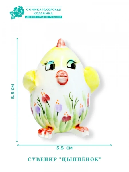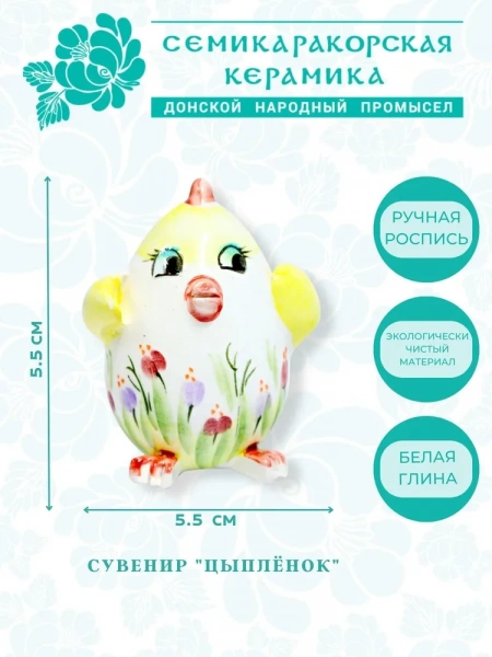 Настоящим ценителям Донских сувениров, советуем обратить внимание на этот сувенир - яркого и солнечного цыплёнка. С помощью такого сувенира можно украсить любой интерьер, добавив изюминку и хорошего настроения в свой дом. Кроме того, такой сувенир можно преподнести в качестве подарка на праздник, как близкому человеку, так и коллеге. Размер в см: высота-5,5; ширина- 4,5