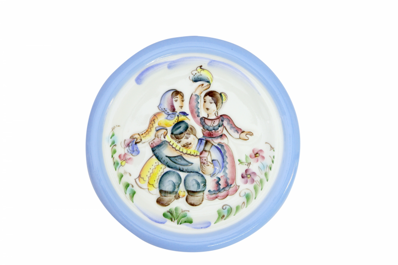 Декоративная тарелка, расписанная вручную, - это возможность не только оживить интерьер, но и внести в него частичку души. Данная декоративная тарелка особенно придется по вкусу ценителям донских сувениров. Изделие декорировано подглазурной сюжетной росписью, изображающей казака, играющего на гармошке и двух веселых казачек. Украшает изделия небольшая цветочная роспись. Цветовая гамма теплая, что придает особую нежность.