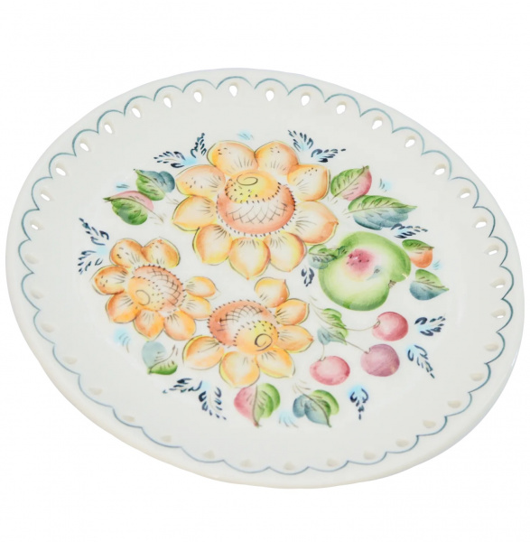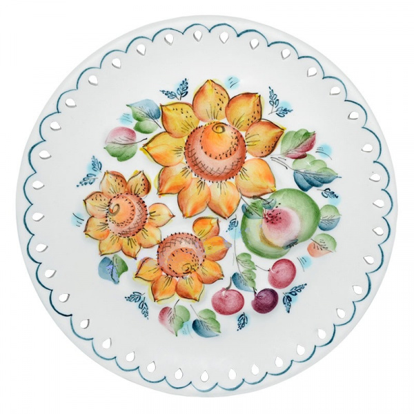 Декоративная тарелка, расписанная вручную - это возможность не только оживить интерьер, но и внести в него частичку души. Данное настенное блюдо декорировано яркой фруктово-ягодной росписью. Выглядит очень нарядно и радостно. Декорировано изделие художественной вырезкой.