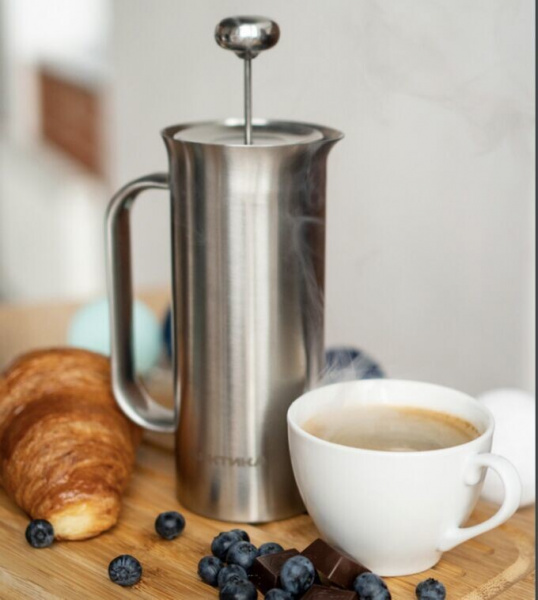 Френч-пресс из нержавеющей стали для напитков объёмом 0,33, 0,6 и 1,1 литра. Двухслойная вакуумная колба из пищевой нержавеющей стали. Стальной цвет.