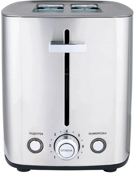 Материал, из которого выполнен корпус устройства, нержавеющая сталь. Она не боится перепада температур, не подвержена коррозии и окислению. Компактные размеры устройства дают возможность разместить его даже там, где мало места. Прорезиненные ножки снижают опасность падения тостера с гладкой поверхности. Поддон для крошек делает простой очистку устройства. Понятное механическое управление не вызывает проблем при регулировке параметров.