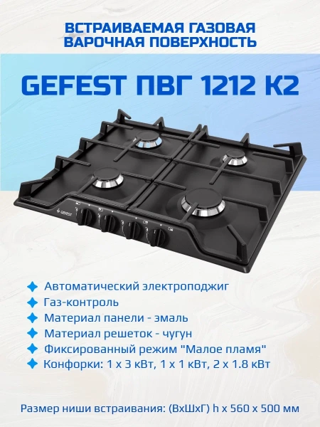 Варочная панель ГЕФЕСТ ПВГ 1212 К2. Черный цвет лаконично впишется в кухонный гарнитур, а готовить на такой плите захочет каждый. 4 газовые одноконтурные конфорки размещены в привычном положении. Они имеют разную мощность, чтобы вы смогли на большом огне пожарить стейк, а на маленьком потушить овощи. Покрытием служит эмалированная сталь, которая долговечна и устойчива к высоким температурам. Решетки выполнены из чугуна, чтобы даже самая тяжелая посуда не смогла ее погнуть. Специальная функция «Малое пламя» позволит не затухать пламени на минимальной температуре, при этом вы сможете долго томить мясо без опасений, что оно пригорит.