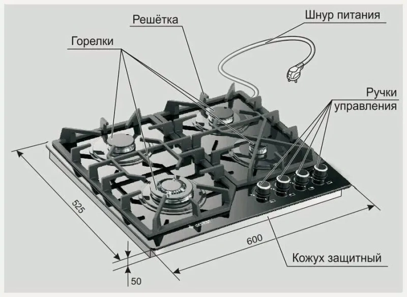 Поверхность гладкая, износостойкая, но может треснуть при падении на нее твердого, острого предмета. Плавная регулировка пламени позволяет точно регулировать силу нагрева. Ручку управления можно зафиксировать в положении «малое пламя». Этот режим подходит для тушения и томления блюд. Управление осуществляется с помощью поворотных ручек. Встроенный электроподжиг позволяет зажечь пламя поворотом вентиля. Плита работает с природным и сжиженным газом из баллонов. То есть модель можно использовать не только в городе, но и на даче, в деревне.