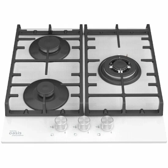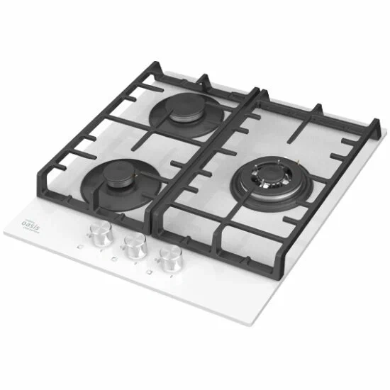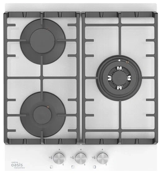 Независимая встраиваемая газовая панель «making Oasis everywhere» P-3GWT белого цвета оснащена тремя конфорками мощностью 0,9 кВт, 1,7 кВт и 3,3 кВт. На корпусе находится панель с механическим управлением — регуляторы оформлены в бронзовом цветовом решении. Варочная поверхность изготовлена из закалённого стекла и дополнена решёткой из чугуна. Ширина и глубина составляют 46х52 см при весе 12,8 кг. Модель получила жиклеры и штуцер для газового баллона, а также газконтроль каждой конфорки.