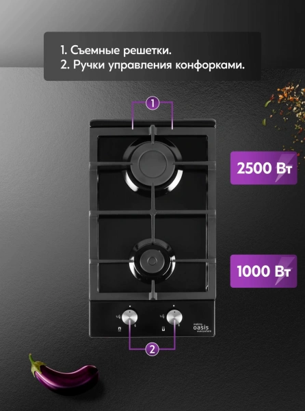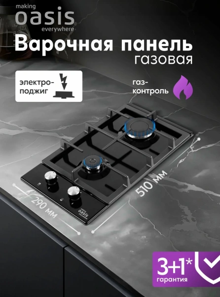 Встраиваемая варочная панель газовая экономна и проста в эксплуатации, кроме того, газовые горелки очень быстро нагреваются, создавая равномерный прогрев продуктов. Для безопасного и комфортного использования газовая варочная панель 2 конфорки оснащена системами автоподжига и «Газ-контроль», который автоматически перекроет подачу газа и исключит вероятность утечки. Газовая варочная панель встраиваемая выполнена из металла, который обладает высокой ударопрочностью, термостойкостью, а также прост в уходе. Варочная панель газовая 2 конфорки имеет чугунную решетку. Чугун - прочный, надежный, долговечный материал для решеток газовой печи. Чугунные решетки не прогибаются под весом, а шероховатая фактура, не дает посуде скользить. В комплект входят форсунки для перевода на сжиженный газ. Готовьте вкусные блюда вместе с варочными панелями making Oasis everywhere.