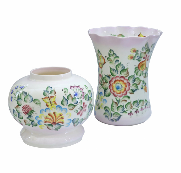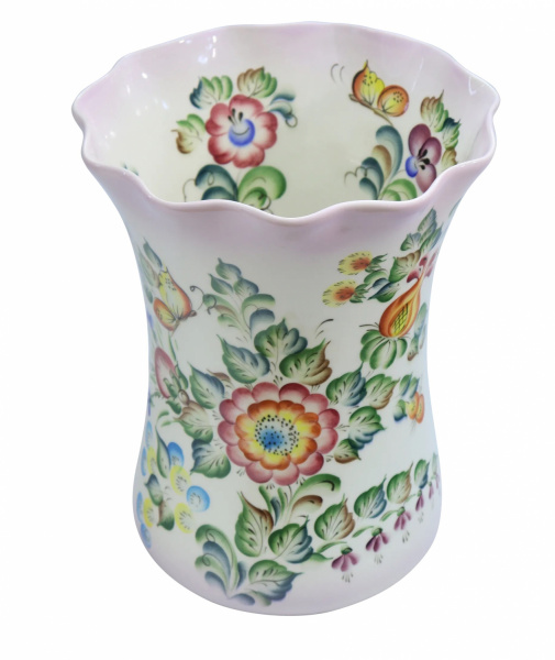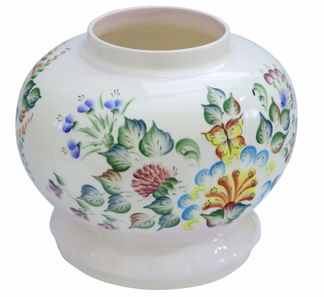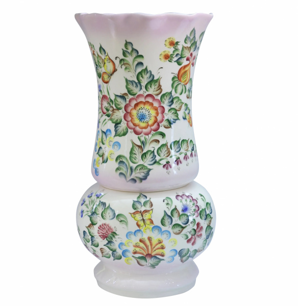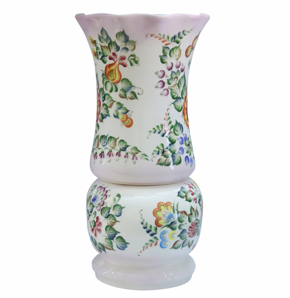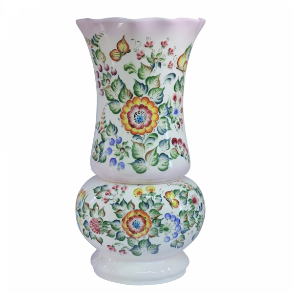 Вместительная и оригинальная ваза изящной формы. Верх изделия снимается, и ваза трансформируется. Декорирована яркой и насыщенной, подглазурной, цветочной росписью. Ваза выглядит нарядно и элегантно. Станет отличным дополнением интерьера.