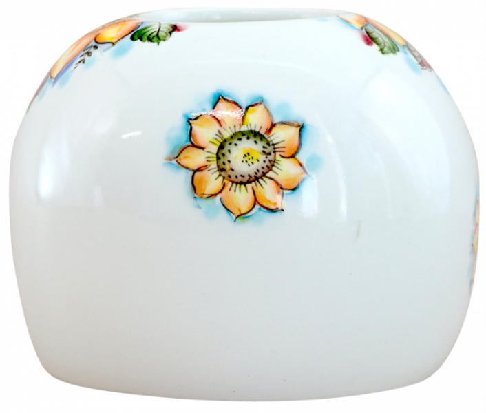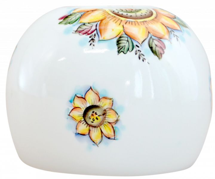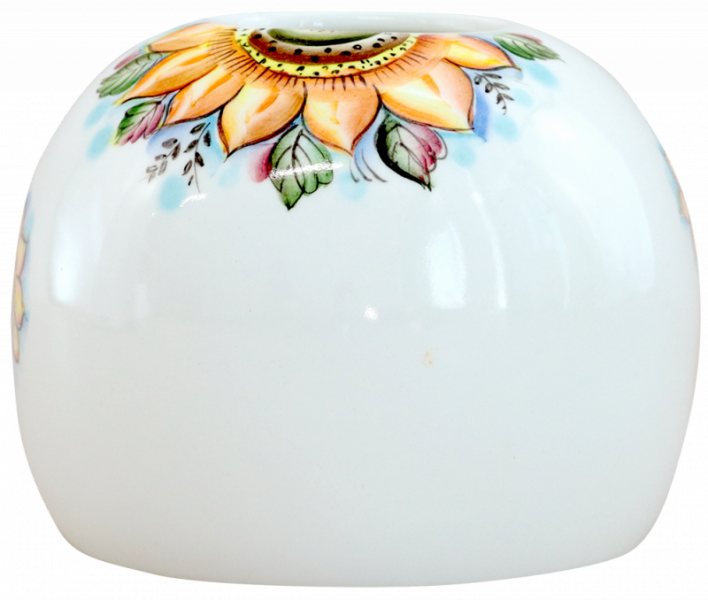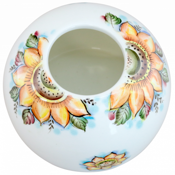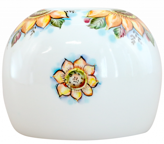 Ваза №4 Подсолнухи подходит как для живых цветов, так и для сухоцветов. Декорирована подглазурной росписью с изображением ярких подсолнухов, изделие эффектно выглядит и гармонично вписывается как в домашнюю обстановку, так и в рабочую, с любым стилем интерьера и дизайна. Ручная работа.