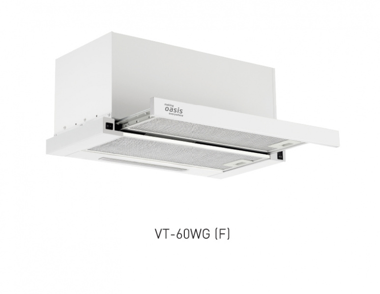 Вытяжка – неотъемлемая деталь чистой и уютной кухни. Сегодня вытяжка не только обеспечивает чистый воздух и порядок, но и является значимым атрибутом декора и освещения, дополняет стиль и дизайн кухни. В последнее время все большим спросом начинают пользоваться встраиваемые вытяжки. Они довольно компактны и монтируются в специальный навесной шкаф над плитой. При этом «на виду» остаётся лишь узкая панель, которая выдвигается вперёд при работе вытяжки. Это нужно для более полного охвата поверхности плиты, чтобы грязный воздух не поднимался к потолку. В зависимости от установки, вытяжка ОАЗИС VT-60WG (F) может работать в двух режимах – режим рециркуляции и режим отвода воздуха в вентиляционную шахту. В первом случае, воздух прогоняется через вытяжку, очищается от запахов, жира и грязи и возвращается обратно. Во втором – вытяжка, посредством гофрированного шланга или пластикового воздуховода подключается к вентиляционной шахте, что позволяет удалять все кухонные испарения за пределы помещения. Такой режим является наиболее экологичным для дома и наиболее эффективным