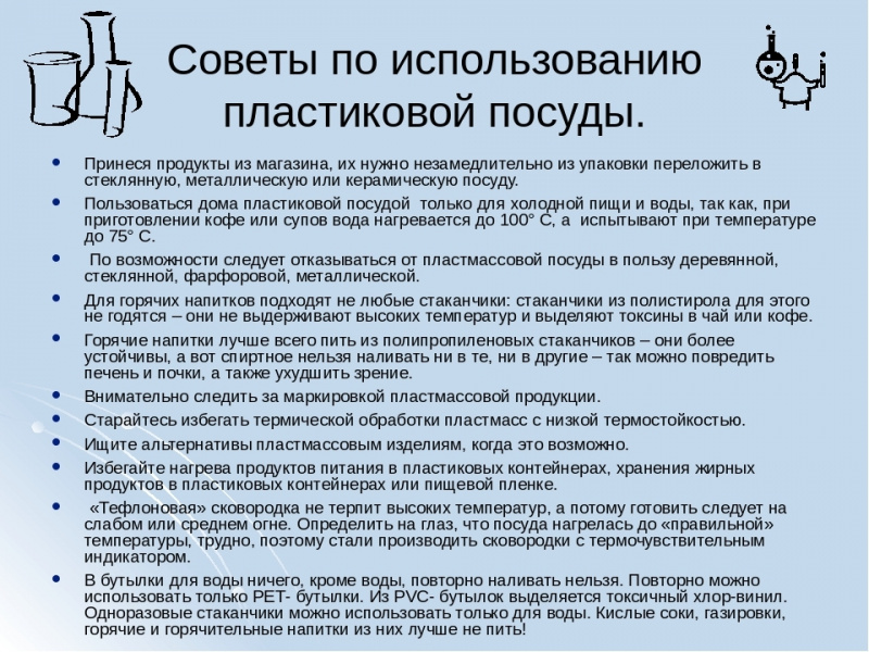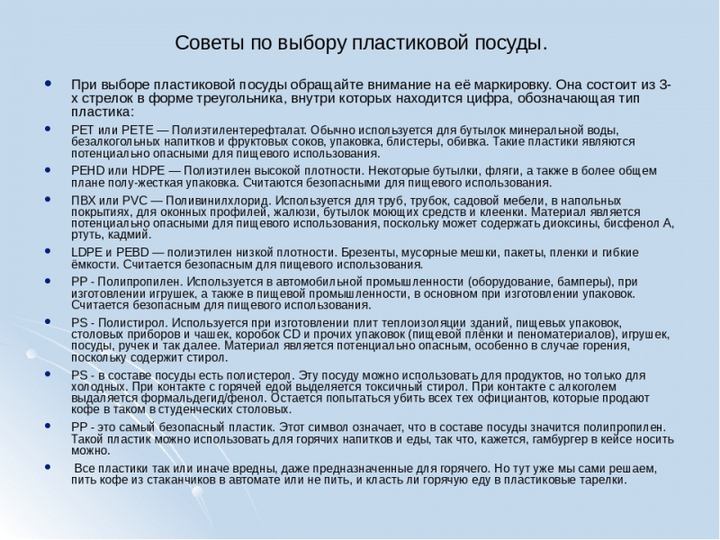 Приобретая посуду из пластика обязательно обращайте внимание на маркеры, указанные на упаковке. К сожалению не все изделия из пластика, реализуемые в розничной сети разрешено использовать в совокупности с пищевыми продуктами. Необходимо знать, как выглядят знаки и понимать расшифровку каждого. Только в этом случае, можно обезопасить себя от приобретения некачественной и вредной посуды.