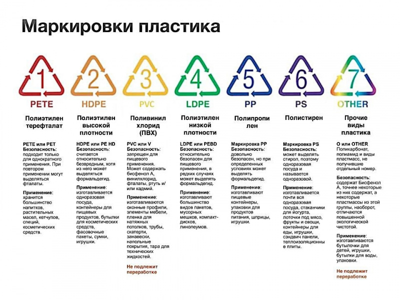 Любая пластиковая тара имеет свое обозначение. В зависимости от типа маркера различают не опасный и опасный для здоровья человека пластик. На пластиковой посуде всегда имеется значок в виде треугольника, состоящего из трех стрелочек. Внутри треугольника нарисована цифра от 1 до 7.
